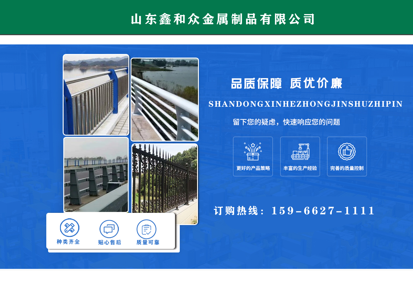 山東鑫和眾金屬制品有限公司主要產品有防撞護欄,橋梁護欄,道路護欄,河道護欄,不銹鋼護欄等護欄。提供設計方案,一站式定制,包您滿意價格優(yōu)惠,歡迎來電咨詢! 公司常年從事銷售護欄防撞護欄,橋梁護欄,道路護欄,河道護欄,不銹鋼護欄,橋梁鋼護欄,河道燈光護欄等。產品廣泛應用于橋梁、河道、旅游景區、道路、公路、公園、小區、景觀、道路防撞等領域?! 」井a品均采用優(yōu)質不銹鋼材料,符合相關標準。各種型號不銹鋼復合管及護欄,質量嚴格把控。產品強度高、耐腐蝕、焊接牢固、抗沖擊、性能好,防撞護欄結構簡單、美觀實用大方。 歡迎前來訂購!...